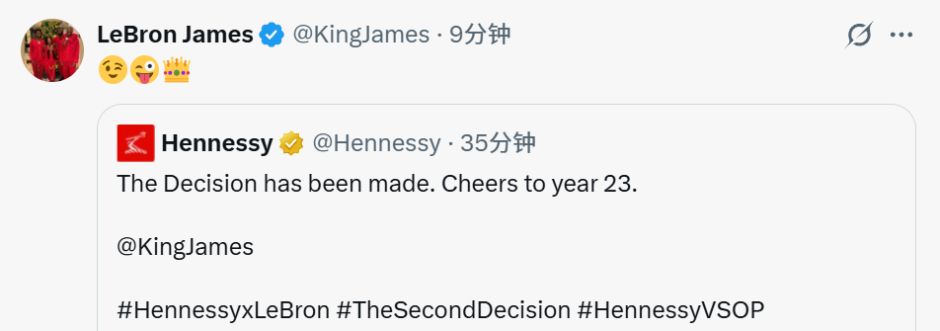 轩尼诗官方介绍,为揭晓此次合作,轩尼诗发起了名为“第二次决定”的社交内容营销活动——巧妙呼应詹姆斯当年极具话题性的“决定”采访。如果说第一次“决定”标志着詹姆斯职业生涯的关键转折,那么此次“第二次决定”则是对双方创意重逢与共同文化影响力的致敬。