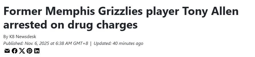 北京时间11月6日,据阿肯德州警方通报,前孟菲斯灰熊队球员托尼-阿伦在波因塞特县的一次交通检查中因涉毒指控被捕。